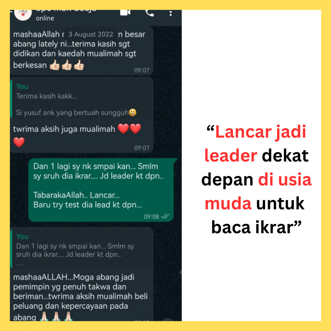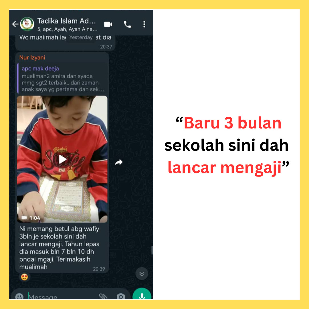 “Anak saya mampu baca Al-Quran dengan baik. Tiba waktu solat, akan solat. Sentiasa buat baik dengan ibu bapa. Sangat menyenangkan hati saya menghantar anak-anak ke Tadika Islam Bangi Adtasim” – Puan Nursana Hamzah